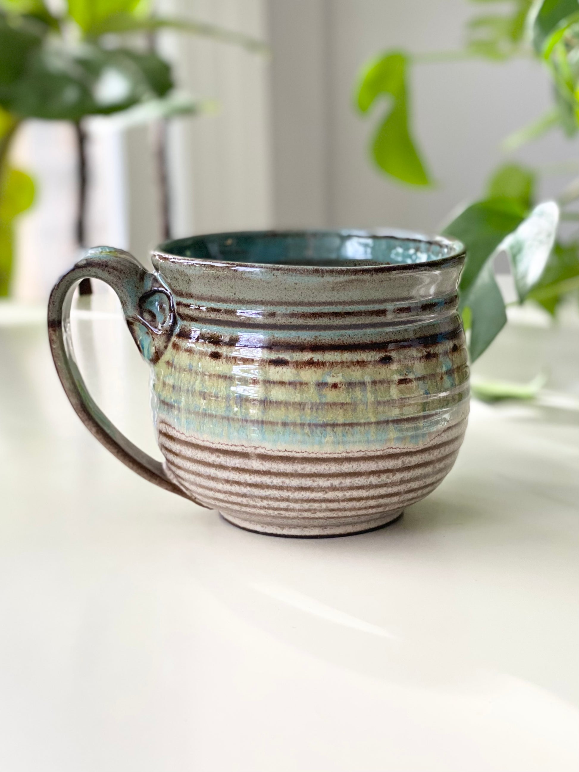 Hand-thrown on the wheel and trimmed with intention, this stoneware mug carries soft layers of earthy green, warm brown, and cream-toned glaze. The glossy glaze settles into gentle drips and quiet shifts of color, creating a grounded, rooted feel — like a forest floor after rain. Fired in oxidation to 2160°, it’s smooth in the hand with a comfortable, easy-grip handle, made for steady mornings and slow, centering sips.