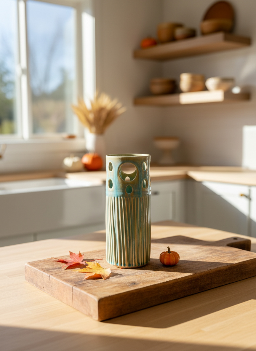 Green Vase, Pierced and Carved, 3.5”x8.5” no.18