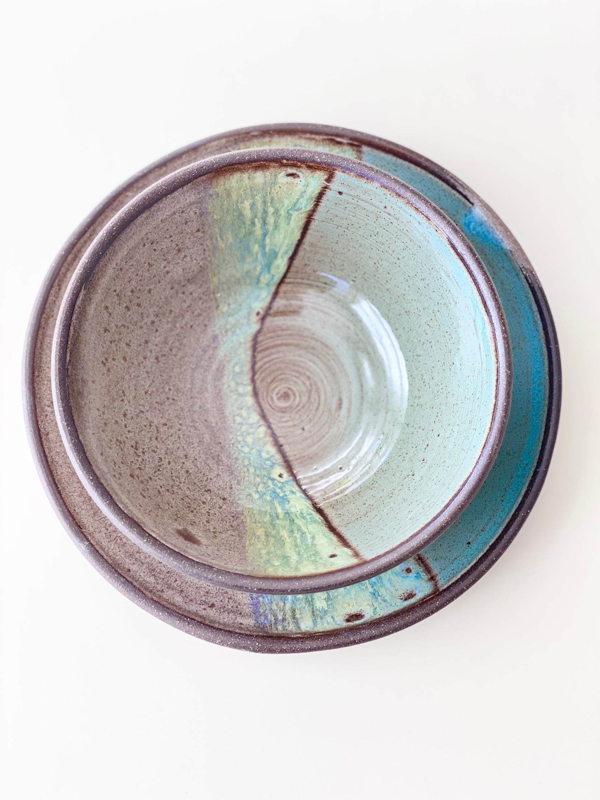 Hand-thrown stoneware pottery, carefully trimmed and layered with premium glazes for rich depth and movement. Oxidation fired to 2160°F, each piece is food safe, dishwasher safe (hand washing recommended), and microwave safe for short use.