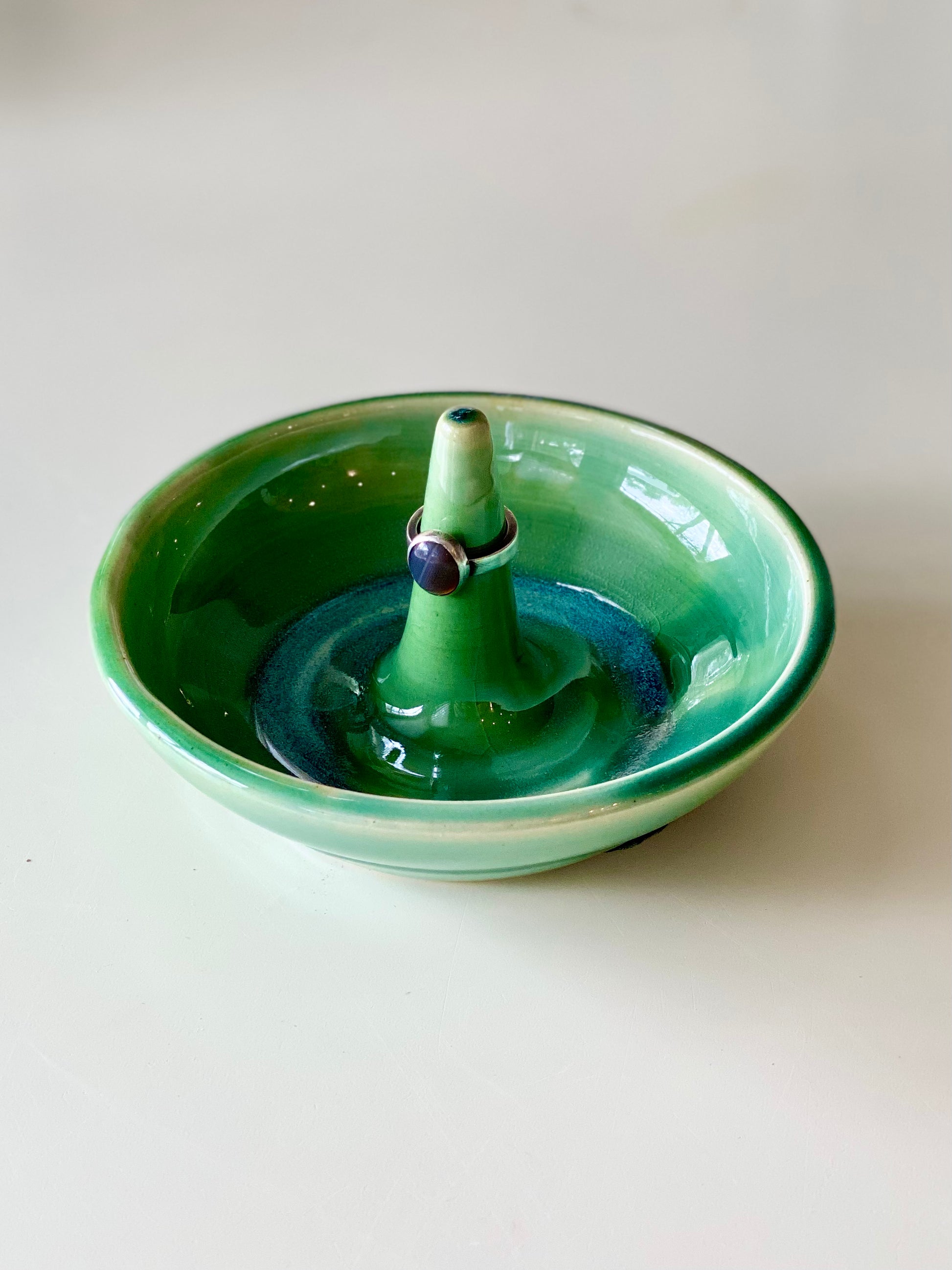 Ring Dish with a glossy green glaze and smooth center ring stem