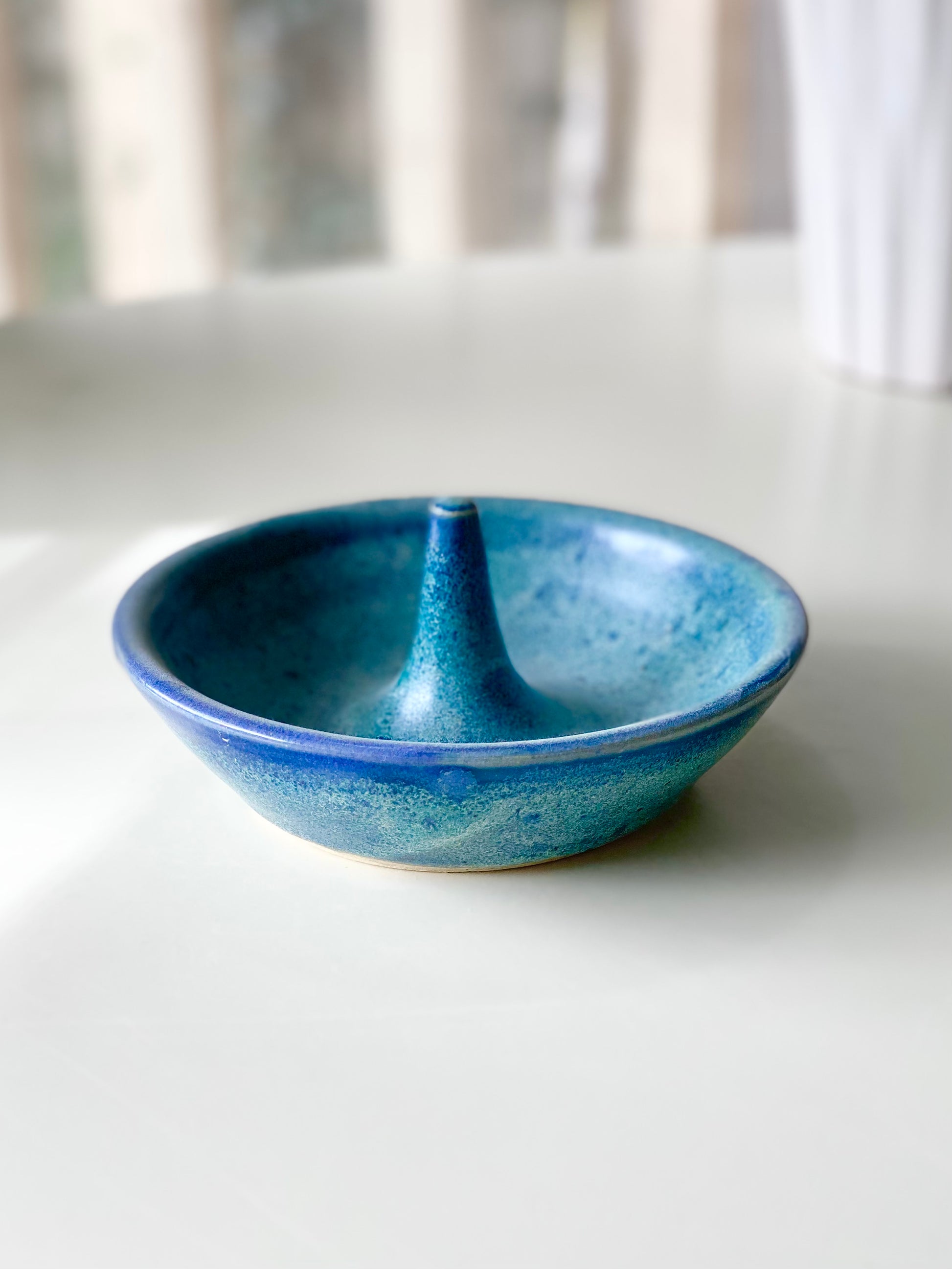 Ring Dish with a speckled ocean-blue glaze and a smooth center ring stem